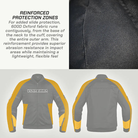 600D Oxford reinforcement along the outer arm and CE Level 2 Powertector armour deliver dependable impact and abrasion protection