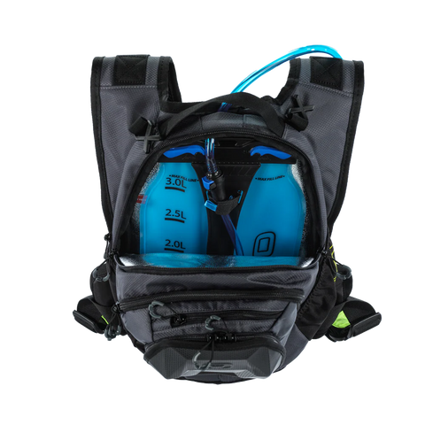 - Dedicated Anti-Sloshing hydration bladder compartment with hook & loop secure strap for holding bladder in place and tube channel port