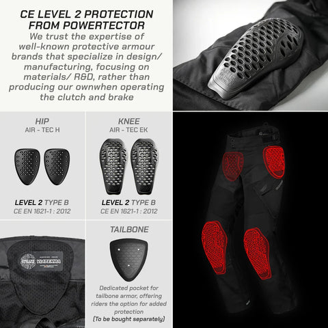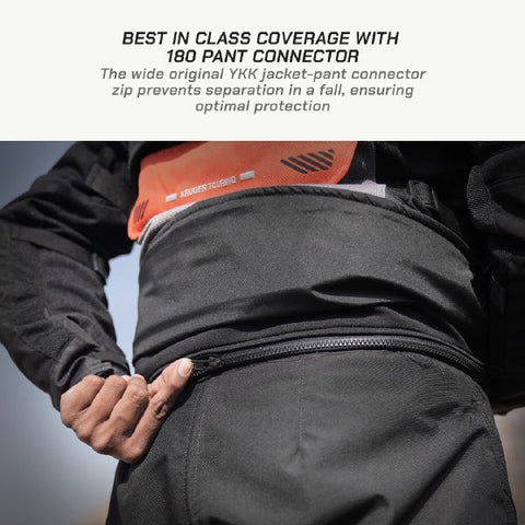You get CE Level 2 Power Tector armour at the knees and hips right out of the box - lightweight, perforated, and certified for top-tier impact protection. Reinforced with dual-layer Cordura at all high-abrasion areas, these pants are ready to take on the roughest trails and longest highway stretches without compromising safety. The 180° pant connector ensures the jacket and pants stay aligned during a fall for full lower-body coverage. Add the optional PowerTector tailbone armour to further level up protection.
