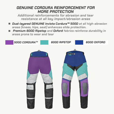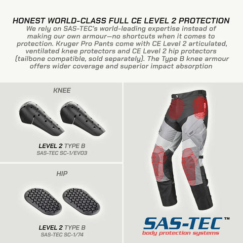 The Kruger Pro Pants feature a dual-reinforced construction with genuine SuperFabric and Invista Cordura at all key impact and abrasion zones for unmatched cut and slide resistance. Supporting areas are reinforced with durable 600D Oxford and Ripstop fabrics for added strength. Heavy-duty fittings, precision stitching, and reinforced panels ensure long-lasting durability for the toughest touring conditions. Level 2 SasTec armours designed with special material that harden on impact while absorbing the energy but remain soft & flexible. Original YKK zippers & pullers for extra durability and smooth operation of zips with best in class coverage with 180 jacket-pant connector.