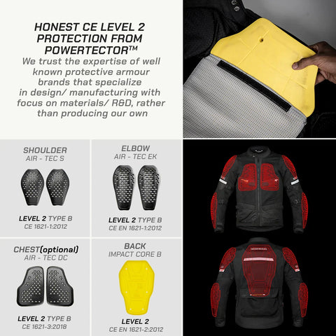 CE LEVEL 2 PROTECTORS - Equipped with CE Level 2 Power Tector armour on the shoulders, elbows, back and chest, the Kruger Air offers serious protection without restricting movement.